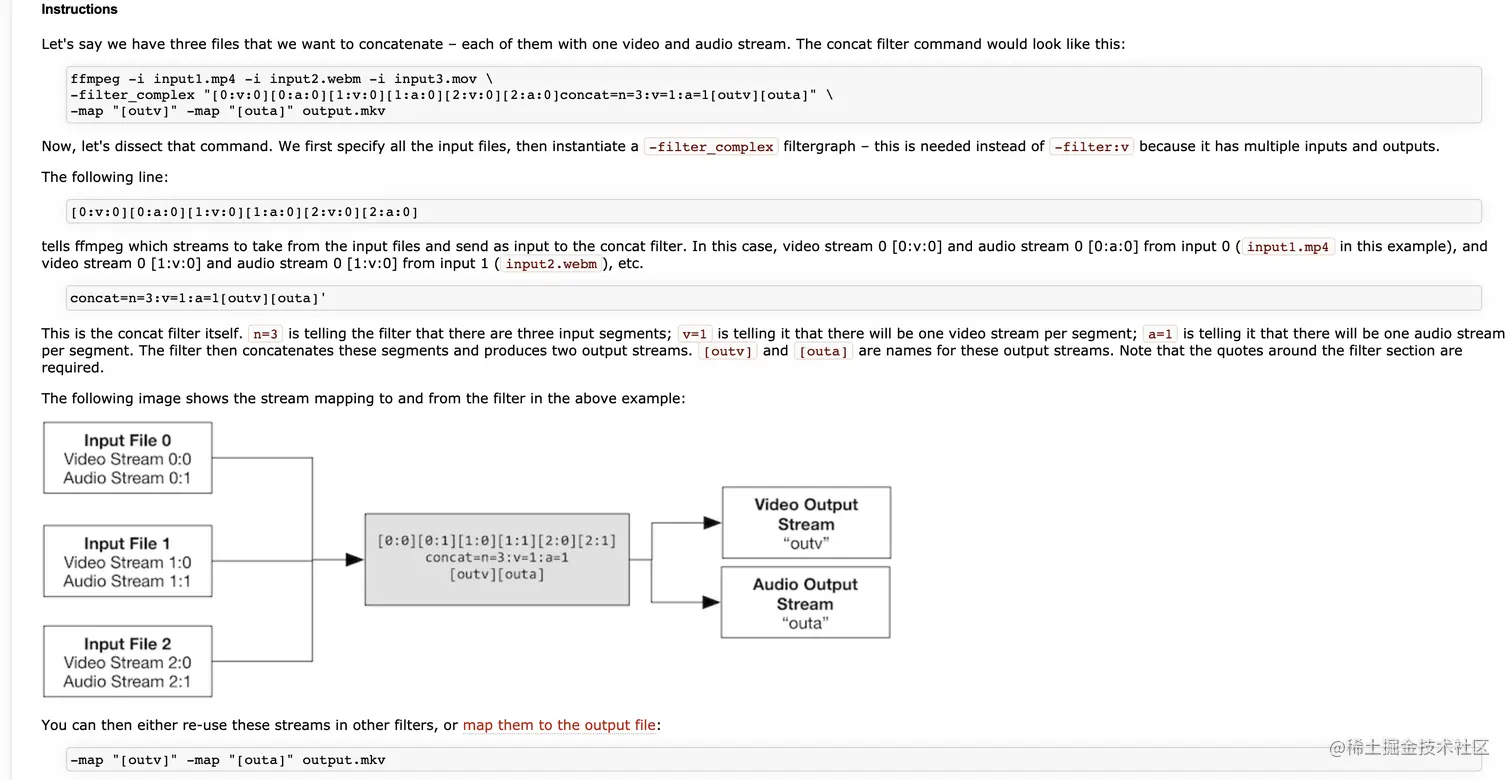 比如concat拼接这个命令,官网给出的原理是这样,一开始看到[0:a][3:v]这些的时候也是一脸懵逼,后来理解了这些是视频,音频的输入