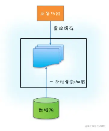 如果源头数据的数据量不大,就可以采用一次性加载的方式,这种方式最简单(可参考下图),只需在应用启动的时候把源头数据查询出来,依次调用类似上面示例代码中的 put() 方法就可以了。