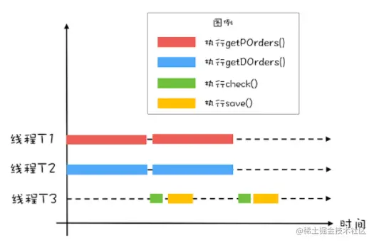 所以,这里你应该能够看出来这个对账系统里的瓶颈:查询未对账订单 getPOrders() 和查询派送单 getDOrders() 是否可以并行处理呢?显然是可以的,因为这两个操作并没有先后顺序的依赖。这两个最耗时的操作并行之后,执行过程如下图所示。对比一下单线程的执行示意图,你会发现同等时间里,并行执行的吞吐量近乎单线程的 2 倍,优化效果还是相对明显的。