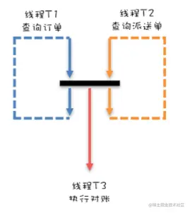 下面这幅图形象地描述了上面的意图:线程 T1 和线程 T2 只有都生产完 1 条数据的时候,才能一起向下执行,也就是说,线程 T1 和线程 T2 要互相等待,步调要一致;同时当线程 T1 和 T2 都生产完一条数据的时候,还要能够通知线程 T3 执行对账操作。