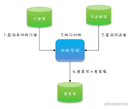 对账系统的处理逻辑很简单,你可以参考下面的对账系统流程图。目前对账系统的处理逻辑是首先查询订单,然后查询派送单,之后对比订单和派送单,将差异写入差异库。