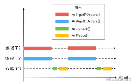 前面我们将 getPOrders() 和 getDOrders() 这两个查询操作并行了,但这两个查询操作和对账操作 check()、save() 之间还是串行的。很显然,这两个查询操作和对账操作也是可以并行的,也就是说,在执行对账操作的时候,可以同时去执行下一轮的查询操作,这个过程可以形象化地表述为下面这幅示意图。