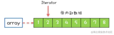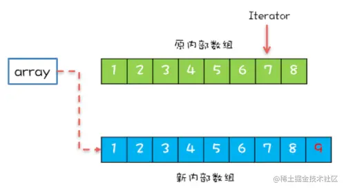 CopyOnWriteArrayList 内部维护了一个数组,成员变量 array 就指向这个内部数组,所有的读操作都是基于 array 进行的,如下图所示,迭代器 Iterator 遍历的就是 array 数组。