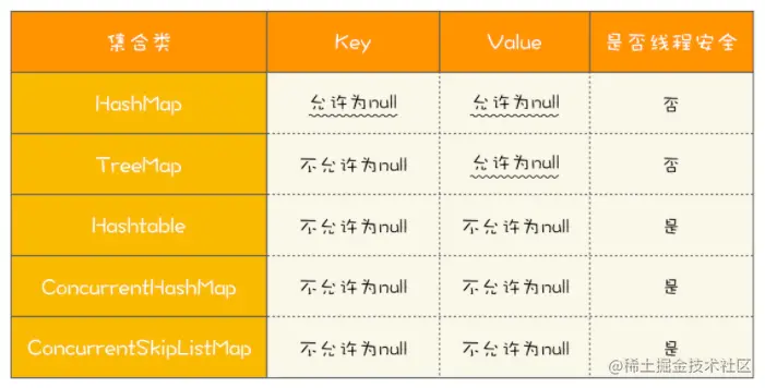 使用 ConcurrentHashMap 和 ConcurrentSkipListMap 需要注意的地方是,它们的 key 和 value 都不能为空,否则会抛出NullPointerException这个运行时异常。下面这个表格总结了 Map 相关的实现类对于 key 和 value 的要求。
