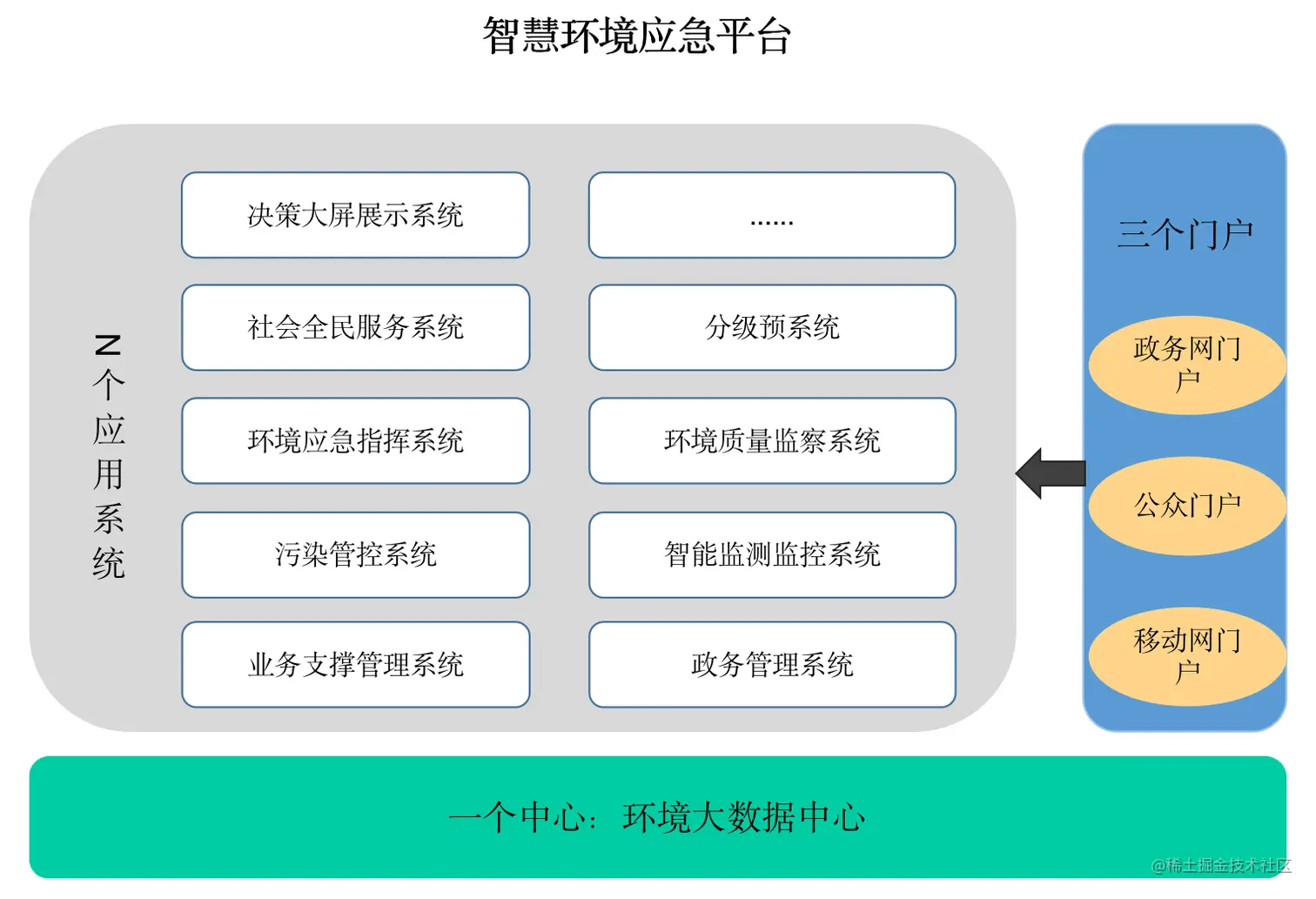 **三个门户:**智慧环保体系项目庞大,建设了多套业务系统,建设统一的政务网门户、公众网门户、移动门户,统领所有业务系统,实现系统的**单点登录**,让智慧环保业务系统形成一个有机的整体。