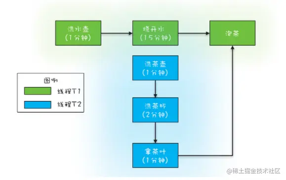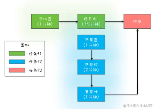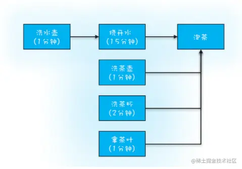 记得以前初中语文课文里有一篇著名数学家华罗庚先生的文章《统筹方法》,这篇文章里介绍了一个烧水泡茶的例子,文中提到最优的工序应该是下面这样: