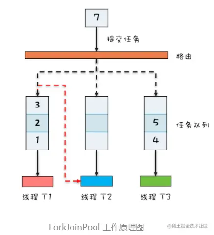 ForkJoinPool 本质上也是一个生产者 - 消费者的实现,但是更加智能,你可以参考下面的 ForkJoinPool 工作原理图来理解其原理。ThreadPoolExecutor 内部只有一个任务队列,而 ForkJoinPool 内部有多个任务队列,当我们通过 ForkJoinPool 的 invoke() 或者 submit() 方法提交任务时,ForkJoinPool 根据一定的路由规则把任务提交到一个任务队列中,如果任务在执行过程中会创建出子任务,那么子任务会提交到工作线程对应的任务队列中。