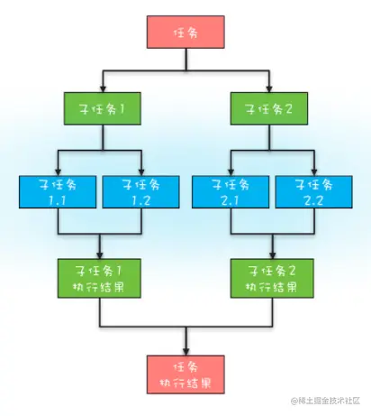 上面提到的简单并行、聚合、批量并行这三种任务模型,基本上能够覆盖日常工作中的并发场景了,但还是不够全面,因为还有一种“分治”的任务模型没有覆盖到。分治,顾名思义,即分而治之,是一种解决复杂问题的思维方法和模式;具体来讲,指的是把一个复杂的问题分解成多个相似的子问题,然后再把子问题分解成更小的子问题,直到子问题简单到可以直接求解理论上来讲,解决每一个问题都对应着一个任务,所以对于问题的分治,实际上就是对于任务的分治。