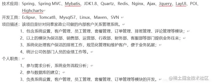 很多同学项目描述这块就是简单的几句话搞定。那这样的内容选拔者感觉到你的项目要么规模太小,要么你在工作中完全不知道总结自己做的项目。