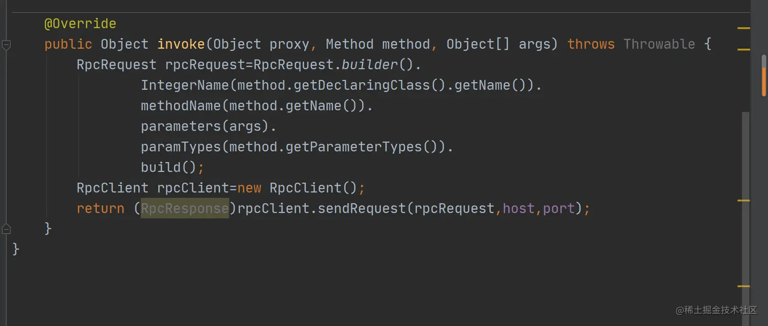 实现InvocationHandler需要实现invoke()方法,指明代理对象方法被调用时的动作,这里我们应该生成RpcRequest对象并发送出去,然后返回从服务端接收的结果即可