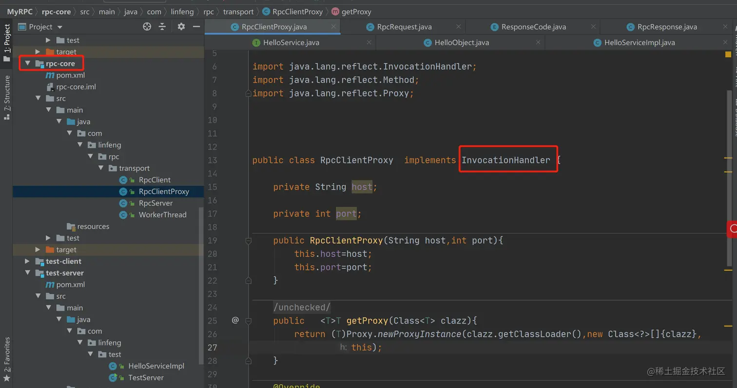 传递的host和post指明服务端的位置,getProxy方法生成代理对象