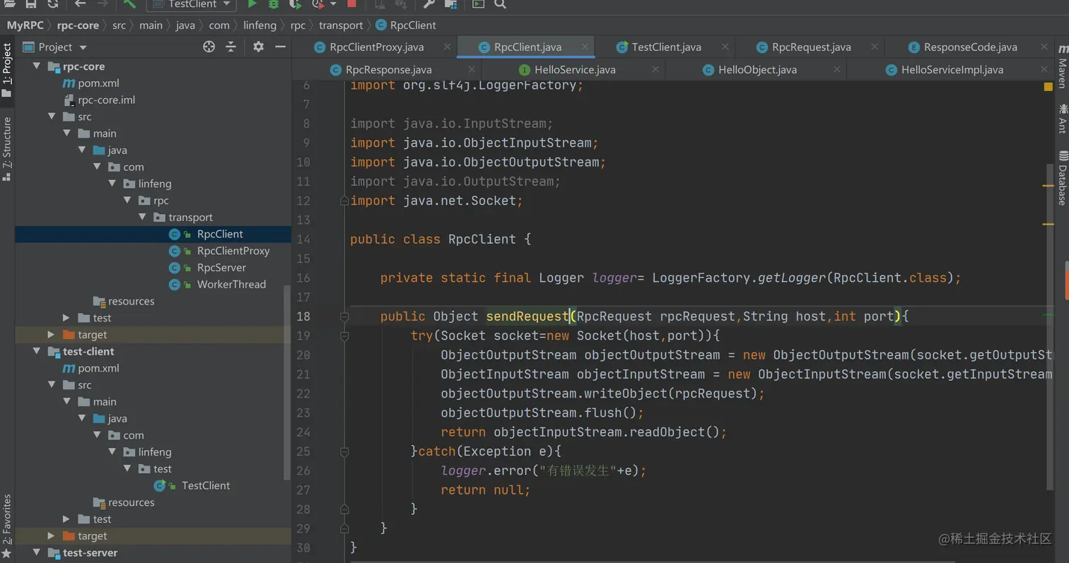 其中,通过class.getMethod方法,传入方法名和方法参数类型即可获得Method对象。如果你上面RpcRequest中使用String数组来存储方法参数类型的话,这里你就需要通过反射生成对应的Class数组了。通过method.invoke方法,传入对象实例和参数,即可调用并且获得返回值。