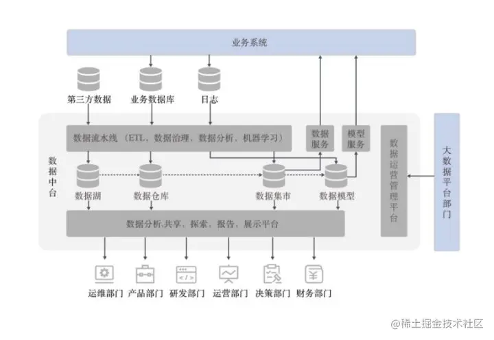 应该说数据中台是建立在数据仓库和数据平台之上的,让业务部门可以更好,更有效率的使用数据的运营管理层,并强调从工具和机制上支持对数据能力的抽象、共享和复用。