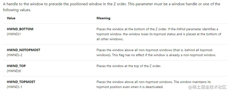 对了,发现了MSDN官网的解释都存在错误,HWND_TOPMOST后面的Meaning第一句应该是:Places the window above all topmost windows. 太坑了,理解了半天,对英语差的人太不友好了。