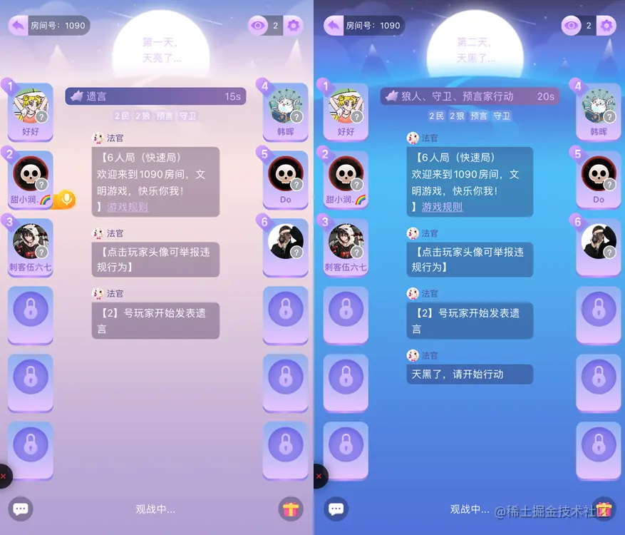 而为了尽可能的还原线下游戏场景,在解决了上述痛点外,平台还需参考线下场景进行业务形态设计。比如,游戏过程中要分为“白天”和“黑夜”不同的场景,在白天环节,所有玩家在同一个房间发言互动,而在黑夜环节,所有狼人玩家切换到其他房间进行私聊分享。
