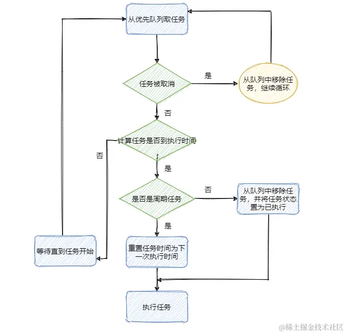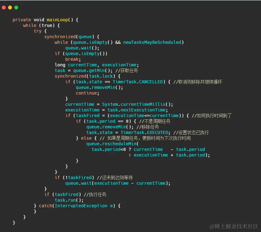 然后 TimerThread 不断地拿排着的第一个任务的执行时间和当前时间做对比。如果时间到了先看看这个任务是不是周期性执行的任务,如果是则修改当前任务时间为下次执行的时间,如果不是周期性任务则将任务从优先队列中移除。最后执行任务。如果时间还未到则调用 wait() 等待。