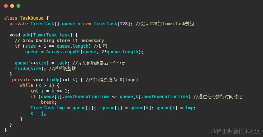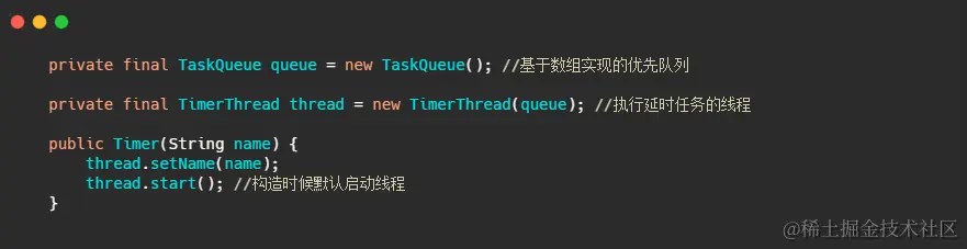 核心就是一个优先队列和封装的执行任务的线程,从这我们也可以看到一个 Timer 只有一个线程执行任务。