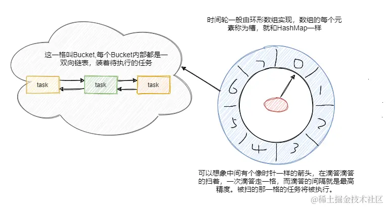 槽的内部用双向链表存着待执行的任务,添加和删除的链表操作时间复杂度都是 O(1),槽位本身也指代时间精度,比如一秒扫一个槽,那么这个时间轮的最高精度就是 1 秒。