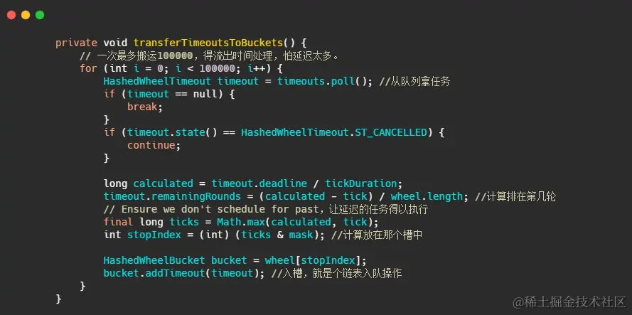 总体上看 Netty 的实现就是上文说的时间轮通过轮数的实现,完全一致。可以看出时间精度由 TickDuration 把控,并且工作线程的除了处理执行到时的任务还做了其他操作,因此任务不一定会被精准的执行。