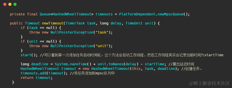 可以看到任务并没有直接添加到时间轮中,而是先入了一个 mpsc 队列,我简单说下 mpsc 是 JCTools 中的并发队列,用在多个生产者可同时访问队列,但只有一个消费者会访问队列的情况。篇幅有限,有兴趣的朋友自行了解实现。