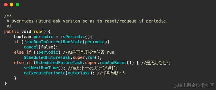 其实 DelayedWorkQueue 就是优先队列,也是利用数组实现的小顶堆。而 ScheduledFutureTask 继承自 FutureTask 重写了 run 方法,实现了周期性任务的需求。