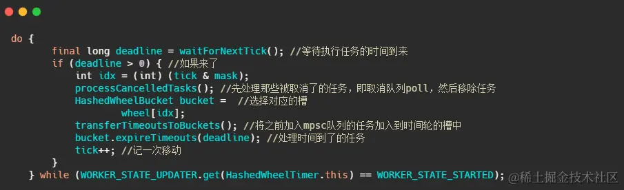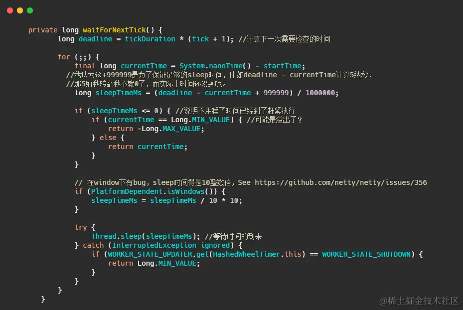 简单的说就是通过 tickDuration 和此时已经滴答的次数算出下一次需要检查的时间,时候未到就sleep等着。