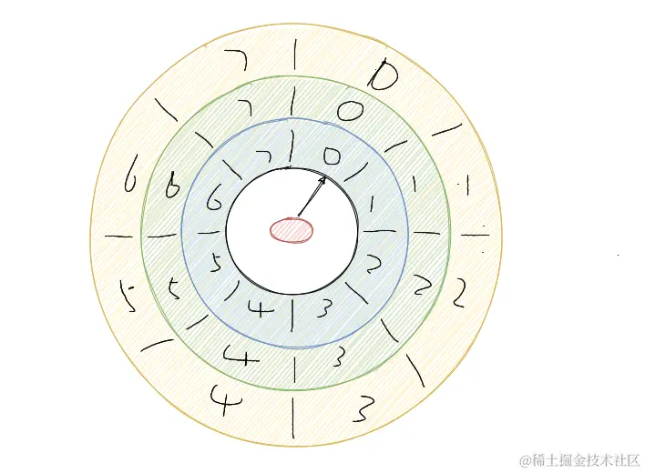 还有一种是通过多层次的时间轮,这个和我们的手表就更像了,像我们秒针走一圈,分针走一格,分针走一圈,时针走一格。