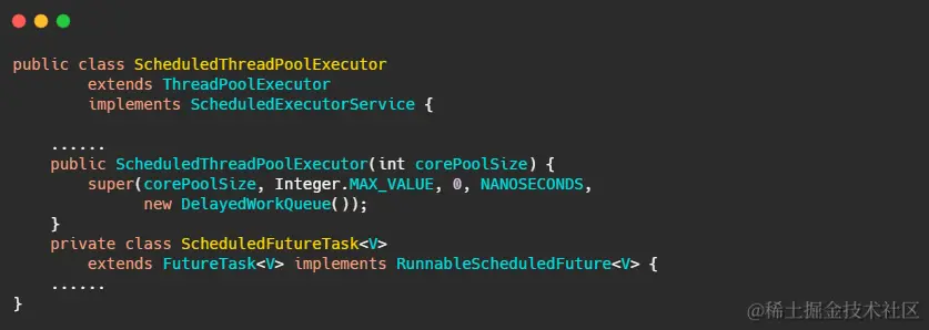 继承了 ThreadPoolExecutor,实现了 ScheduledExecutorService。可以定性操作就是正常线程池差不多了。区别就在于两点,一个是 ScheduledFutureTask ,一个是 DelayedWorkQueue。