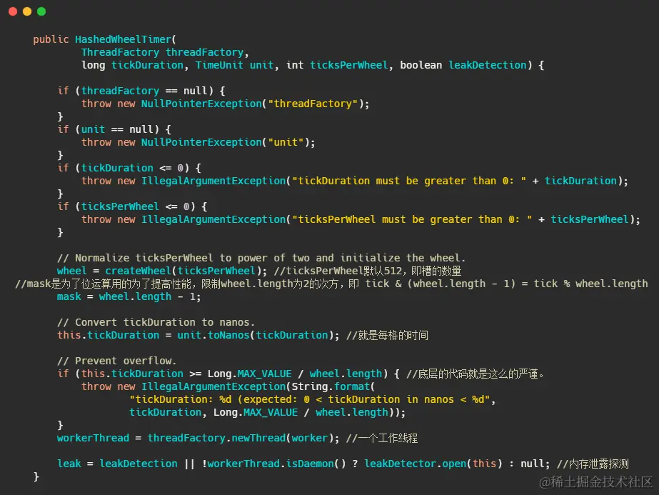 在 Netty 中时间轮的实现类是 HashedWheelTimer,代码中的 wheel 就是上图画的循环数组,mask 的设计和HashMap一样,通过限制数组的大小为2的次方,利用位运算来替代取模运算,提高性能。tickDuration 就是每格的时间即精度。可以看到配备了一个工作线程来处理任务的执行。