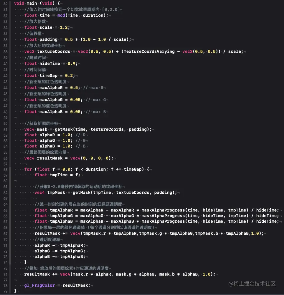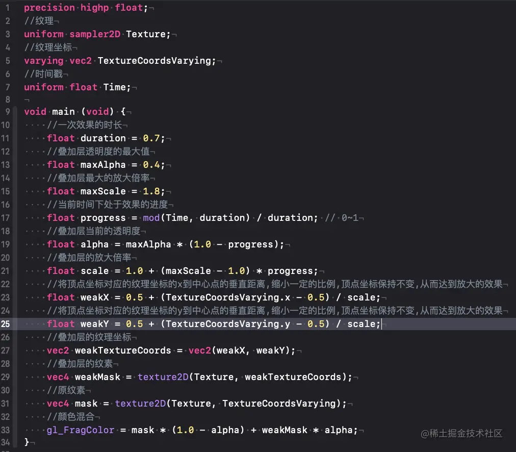 原理 片元着色器中实现算法:两个层的叠加,并且上面的那层随着时间的推移,会逐渐放大且不透明度逐渐降低