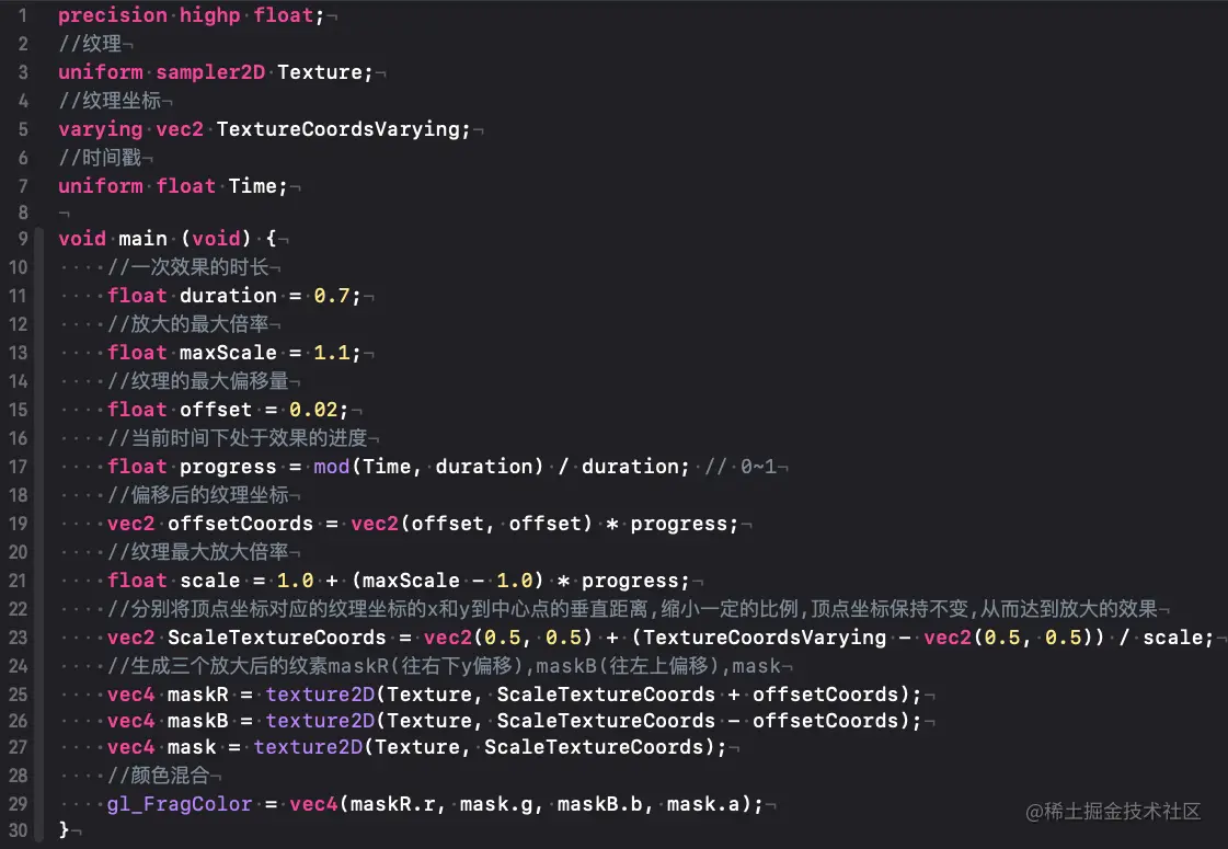 原理 片元着色器中 颜⾊偏移 + 微弱的放大效果