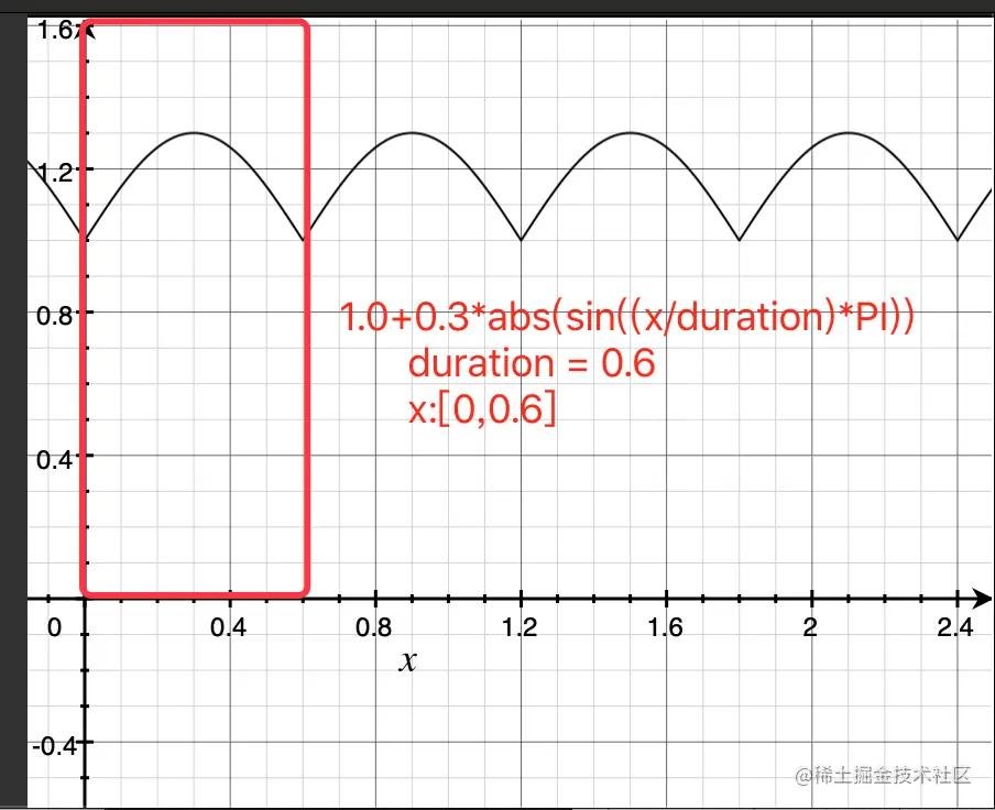 amplitude = 1.0 + maxAmplitude * abs(sin(time * (PI / duration)))的变化曲线如下: