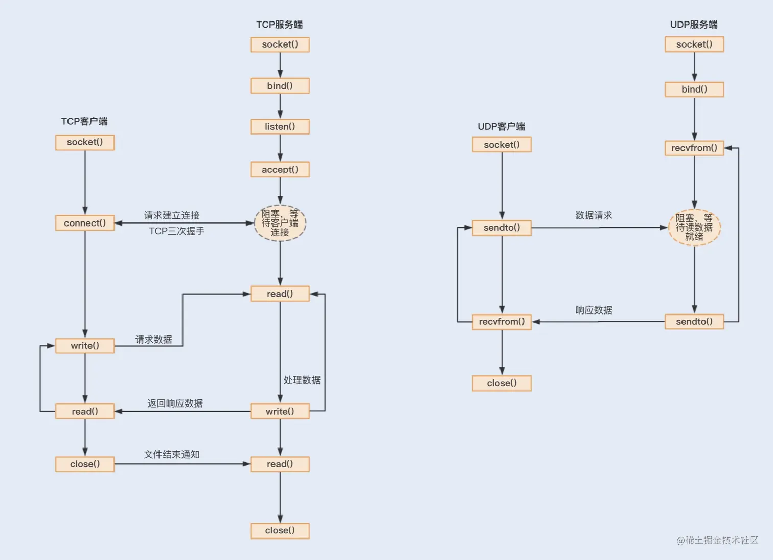 要实现不同机器间的网络通信,我们先要了解计算机系统网络通信的基本原理。网络通信是两台设备之间实现数据流交换的过程,是基于网络传输协议和传输数据的编解码来实现的。其中网络传输协议有 TCP、UDP 协议,这两个协议都是基于 Socket 编程接口之上,为某类应用场景而扩展出的传输协议。通过以下两张图,我们可以大概了解到基于 TCP 和 UDP 协议实现的 Socket 网络通信是怎样的一个流程。