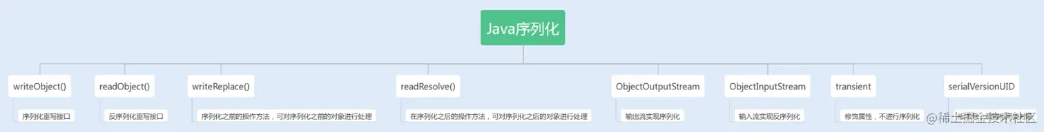 另外,Java 序列化的类中还定义了两个重写方法:writeReplace() 和 readResolve(),前者是用来在序列化之前替换序列化对象的,后者是用来在反序列化之后对返回对象进行处理的。