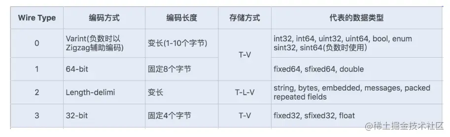 Protobuf 定义了一套自己的编码方式,几乎可以映射 Java/Python 等语言的所有基础数据类型。不同的编码方式对应不同的数据类型,还能采用不同的存储格式。如下图所示: