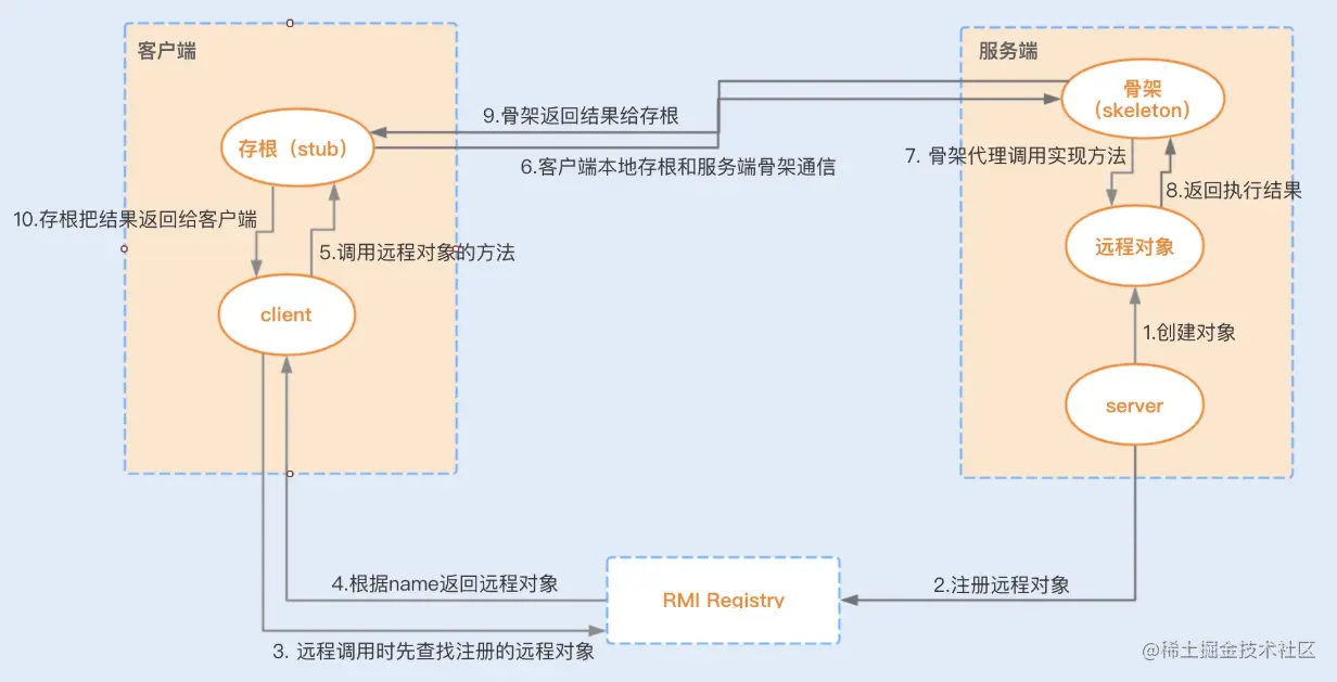 我们可以通过一张图来详细地了解下整个 RMI 的通信过程: