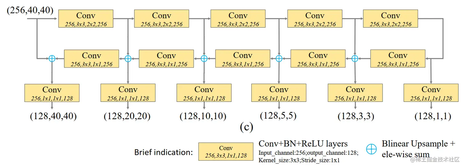 图(a)中的特征金字塔部分,每个尺度的特征图只有1个层次(但非同一层次)的特征表示,与图(c)的区别是,尺度越小的特征图,抽取到的特征层次越高,因为尺度越小的特征图处在网络的位置越深。