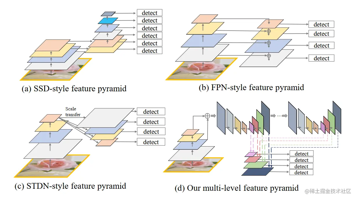 特征金字塔较好地解决了目标检测领域物体尺寸变化的问题,但是也有缺点。下图中(a)、(b)、(c)为主流的、带有金字塔结构的目标检测网络。
