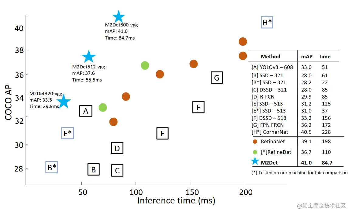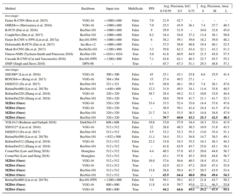 M2Det与其他主流网络对比结果如下表所示,测试数据集为MS COCO test-dev。