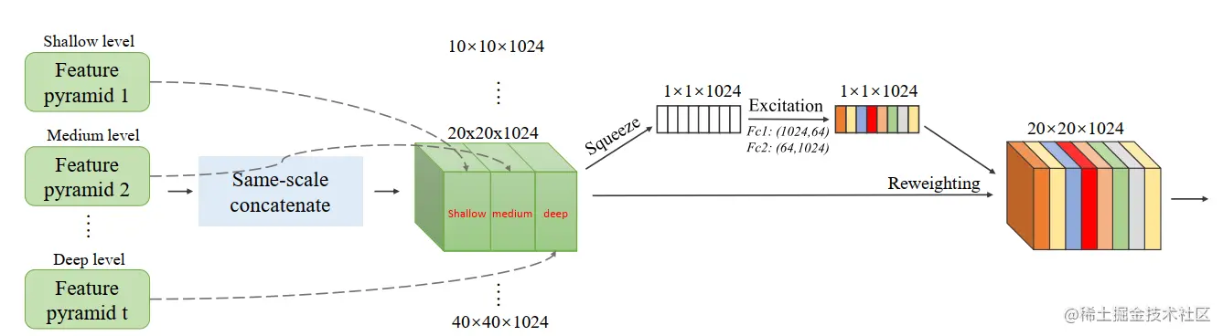 - SFAM(Scale-wise Feature Aggregation Module) SFAM包括两个部分,其一是下图中的Same-scale concatenate部分,将所有TUM的输出特征按特征尺寸分组,同尺寸的特征放在一组中,将同组中的特征按通道维度组合在一起,形成了多尺度、多层次的特征金字塔。相比于传统的特征金字塔,由MLFPN得到的特征金字塔中,每个尺度下有多个不同层次的特征。其二是参考论文Squeeze-and-excitation networks中的方法,进行如下操作(以下图中尺度为20x20的特征为例):