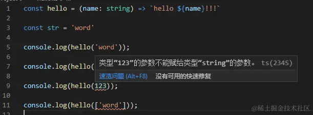 可以看见,将函数的参数输入定义为字符串,在输入其他类型时,在编译的时候就已经提示错误了。