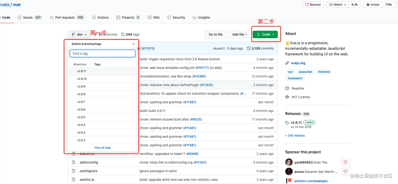 打开想要下载源码的地址,然后选一个自己想要下载版本,点击code下载zip包(ps:如果想要查看git相关的内容的话可以clone,但是只是查看代码的建议直接下载zip包,快捷,方便)