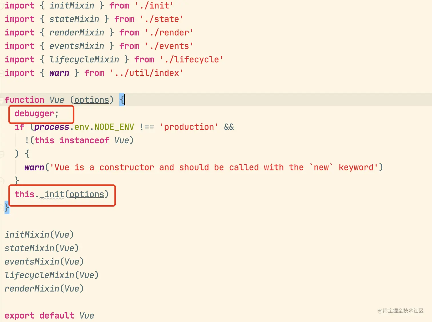 这时候打开instance文件夹下面的index.js文件,就会发现这是一个初始化方法的入口,然后就可以在这里打debugger,跟着debugger去一步步往下看了。