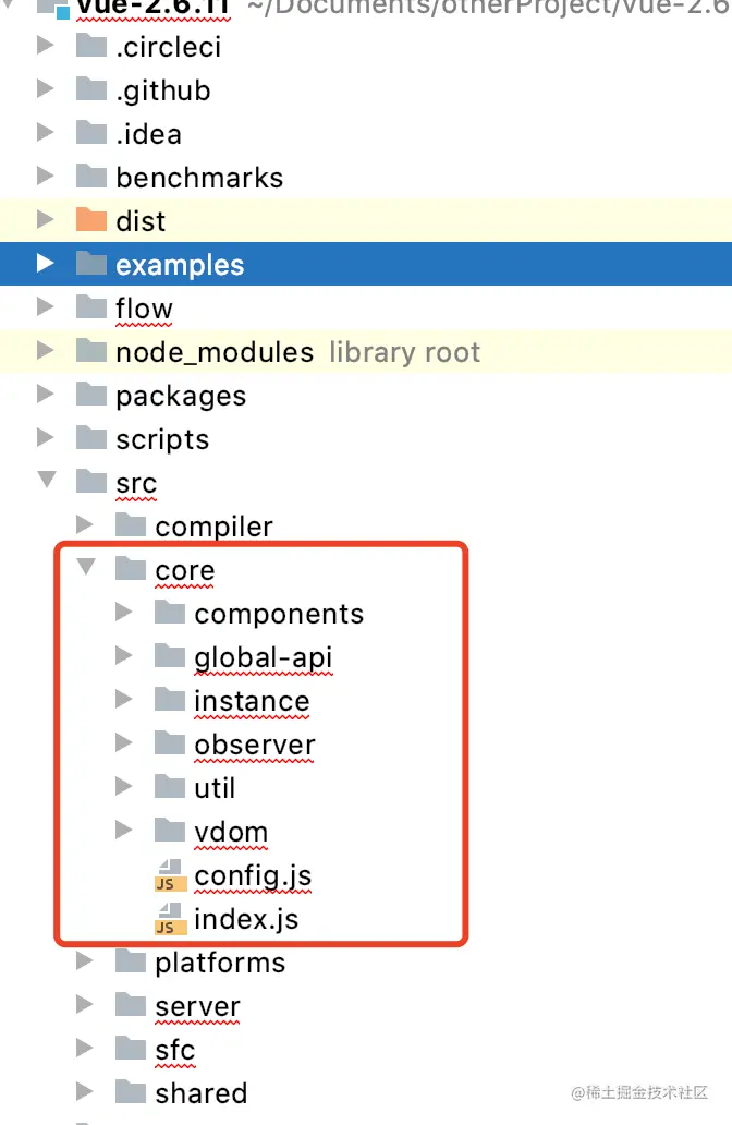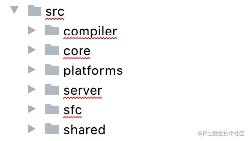 接下来打开src目录,框架的代码都在这个文件夹里面,可以从图中看出,一共有六个模块,一般框架src下面都会有一个index文件,然后在index文件里面可以有哪些核心模块。然而vue框架不是这样的,但是有个很明显的文件夹core,核心文件夹。