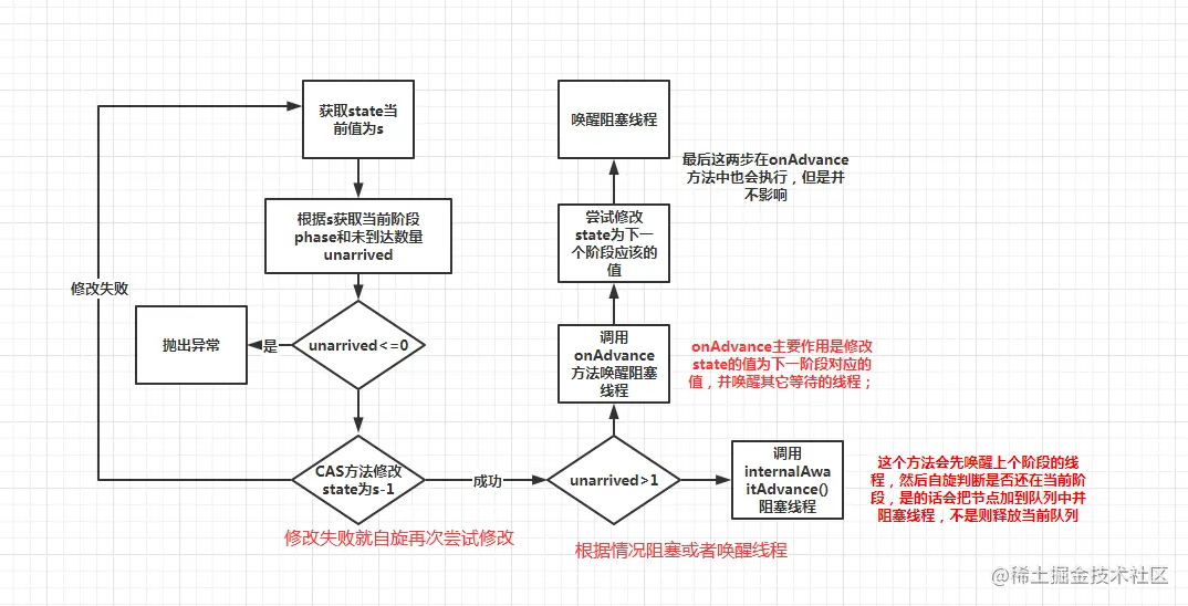(5)最后两步就是修改state的值,实际上就是为下一个阶段做准备,最后再次唤醒等待线程,实际上onAdvance也做了这些事情,这里是多次保证数据完整。