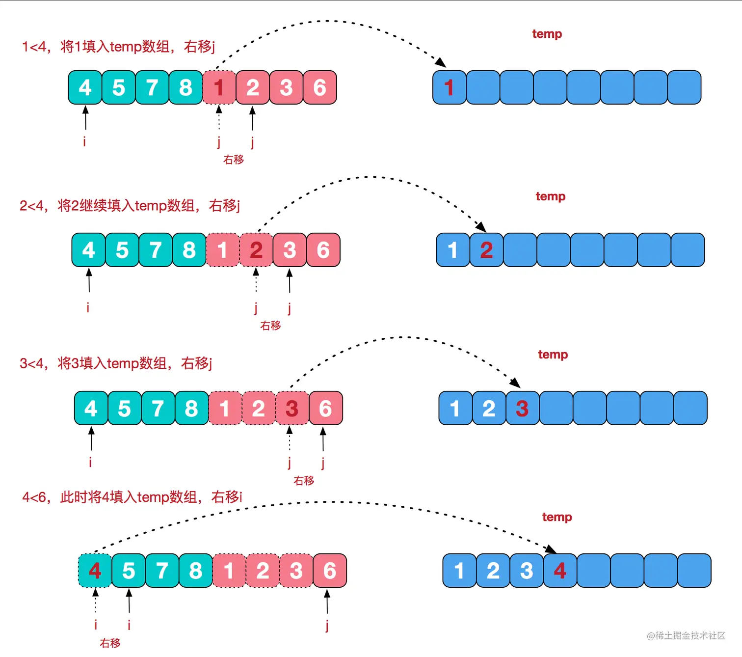temp[k++] = array[i] <= array[j] ? array[i++] : array[j++];