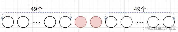 作为聪明机智的小浩(没见过这么夸自己的),最后当然是小浩获胜。获胜的方法:小浩强烈要求先手进行游戏,并且在游戏开始时,先把正中间的两个小圆圈涂黑,于是左右两边各剩下了49个圆圈。像是下面这样: