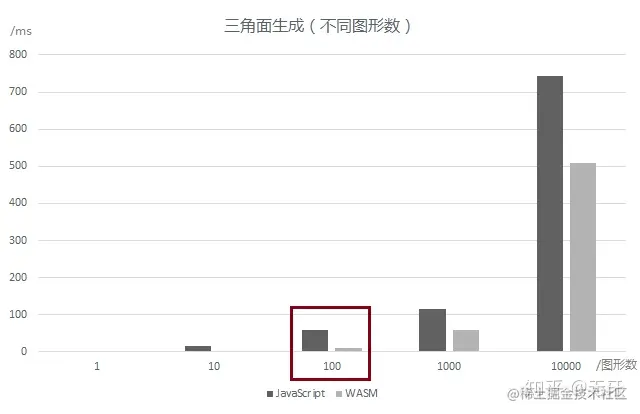 对于单个地图建筑所包含的顶点数,一般介于 10-100 个之间,因此生成 100 顶点的三角面属于常态。对于一个包含100个顶点图形来说,WASM 相对于 JS 平均提效 4.4 倍左右。