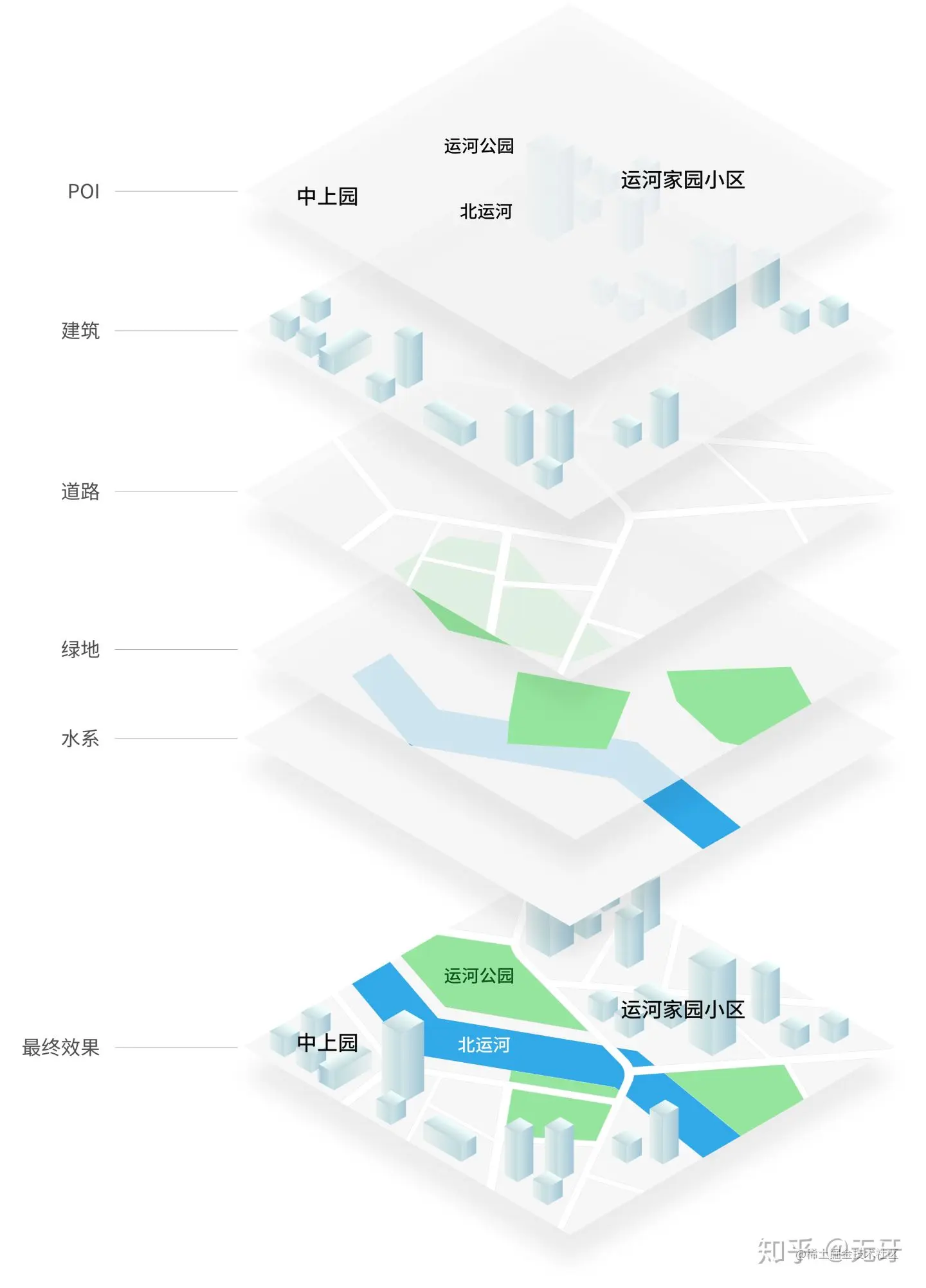 我们使用的矢量瓦片数据源请求来的是二进制数据,首先需要根据与服务端协商的解析规则经过第一层数据解析,得到数据源中的陆地、海洋、功能面、道路、POI、道路名称、建筑面等地理信息。紧接着进入第二层数据处理,是将瓦片数据计算成用来渲染使用的顶点、面、法向和 UV。最后根据样式文件,生成材质纹理等,传给Tile,添加到 Layer 中,完成一次 Tile 的加载、解析、装配、渲染。