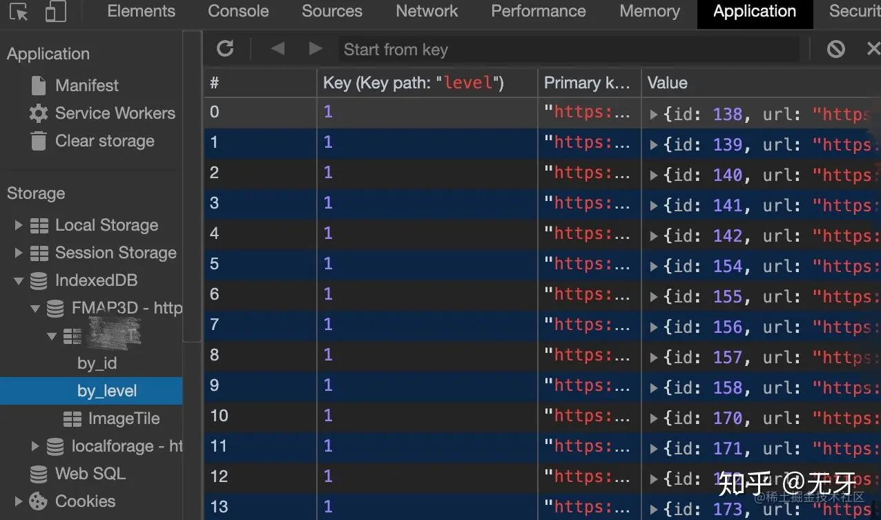 考虑到IndexedDB允许存储大数量,以及是本地化存储,数据处理中的第二层缓存,利用了 IndexedDB 的特性对瓦片中描述的信息数据做了本地化缓存。其中对数据的 level 值做了索引,以提高查询速度。